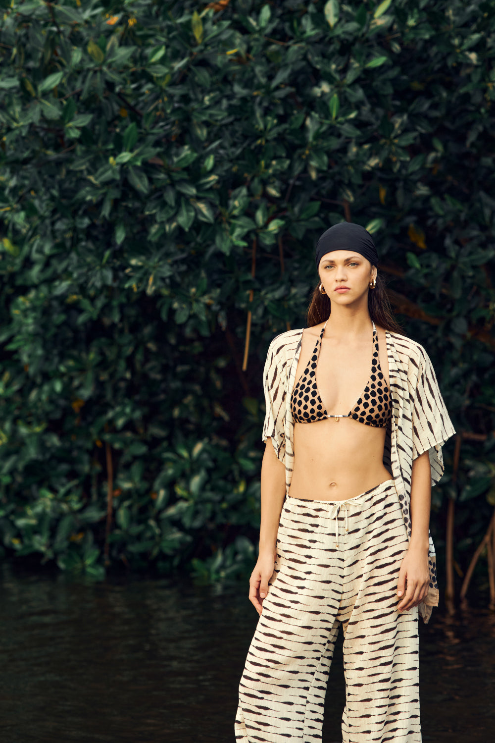 Bikini top triángulo mediano en tela estampada de lunares; tiras para amarrar al cuello y tira base en contraste para amarrar en la espalda que permiten un ajuste ideal al cuerpo; punteras y moneda con grabado ''t'' en baño de oro; copas removibles; y tela con protección uv. Color café / negro, Ref. 0B80062