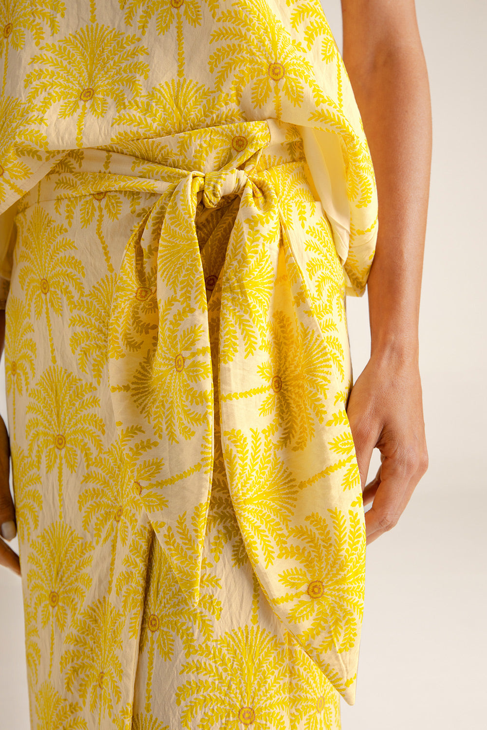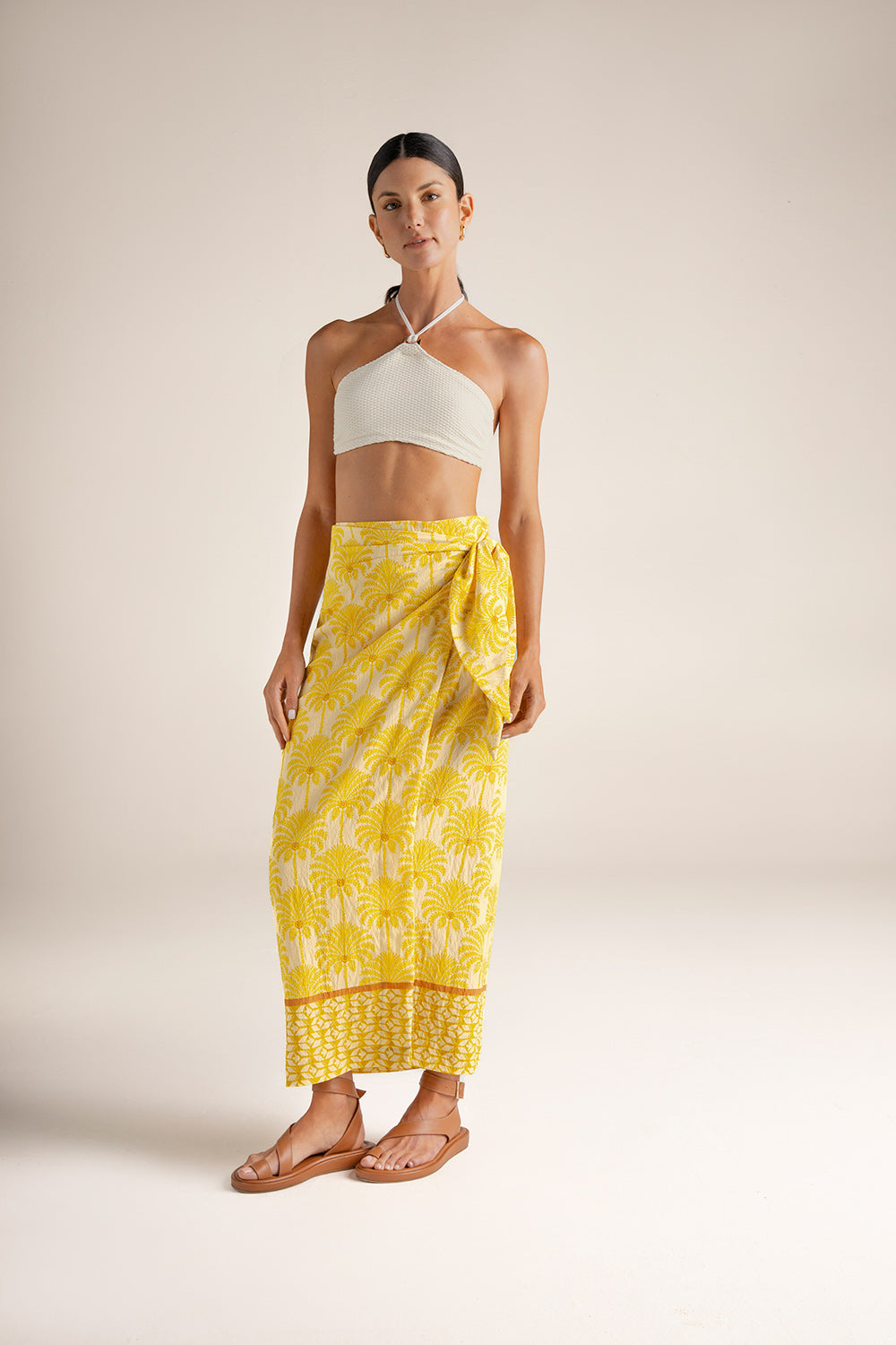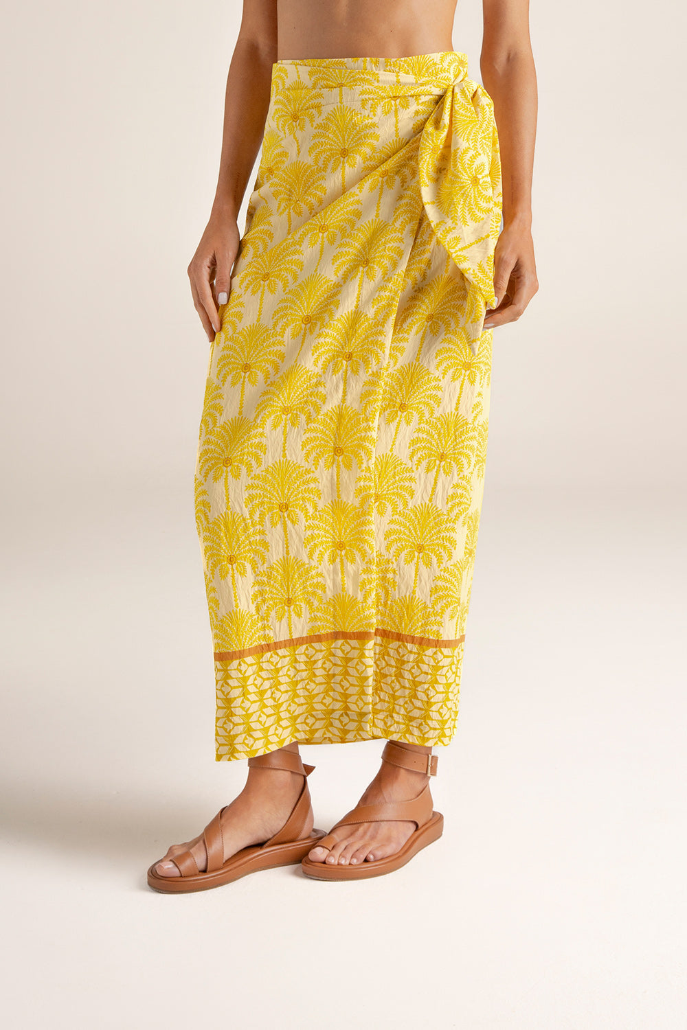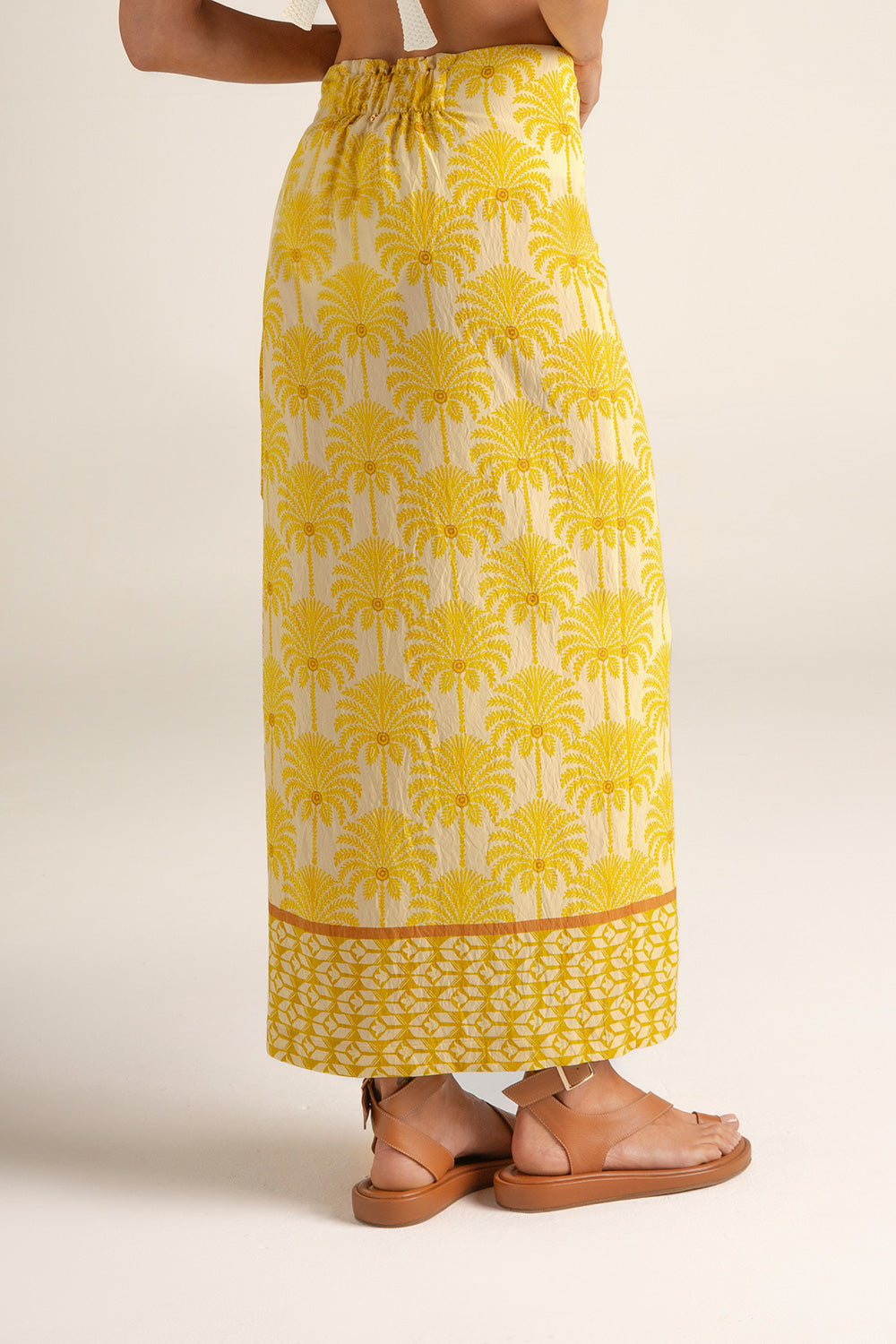Falda pareo larga en tela estampada de palmeras; cruzada al frente con tira ancha ajustable y botones internos; recogido con elástico en la parte posterior para un mejor ajuste al cuerpo; y moneda en baño de oro grabada con la ''t'', detalle distintivo de la marca. Color estampado amarillo / marfil, Ref. 0F70062
