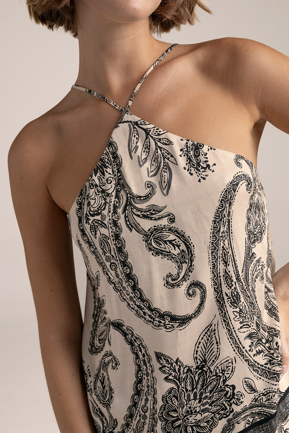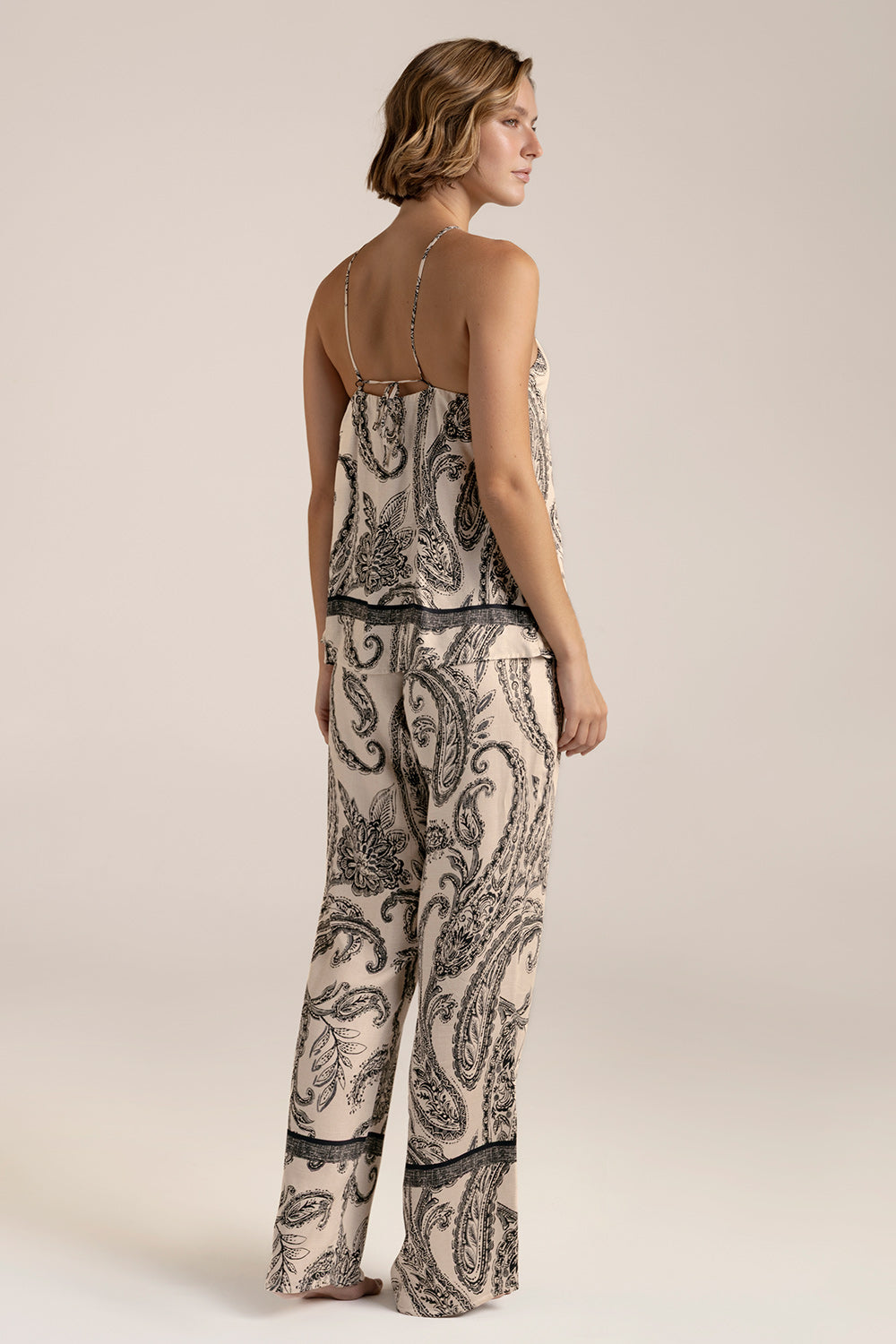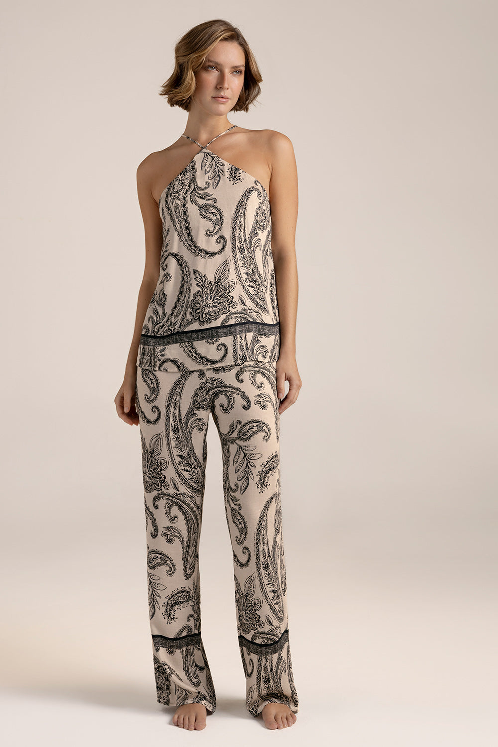 Pijama pantalón elaborada en satén con estampado, camisa halter con top interno para mayor soporte y comodidad, cargaderas ajustables, pantalón recto con corte regular. Color estampado, Ref. 0533062