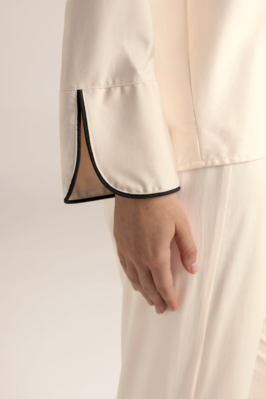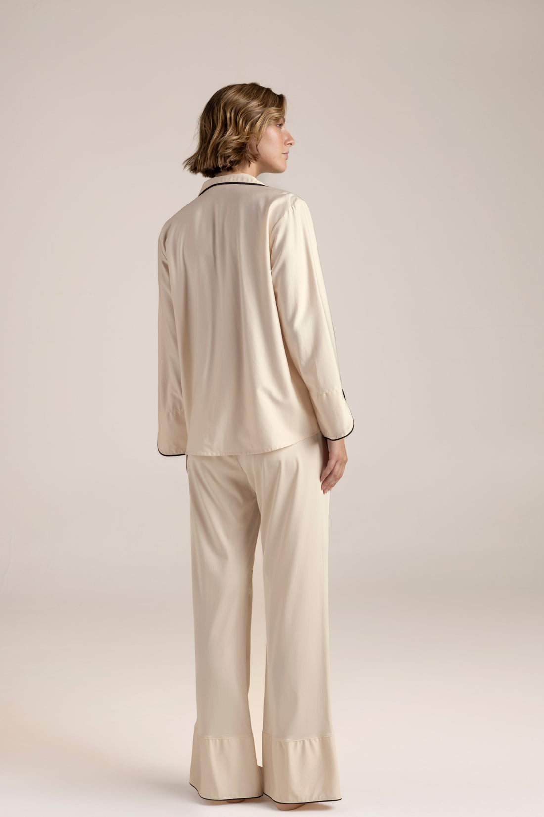 Pijama capri elaborada en viscosa elástica. camisa manga larga, cuello resort con perilla de botones, bolsillo de parche delantero y vivos en contraste. pantalón corto bota recta. Color marfil, Ref. 0527M62