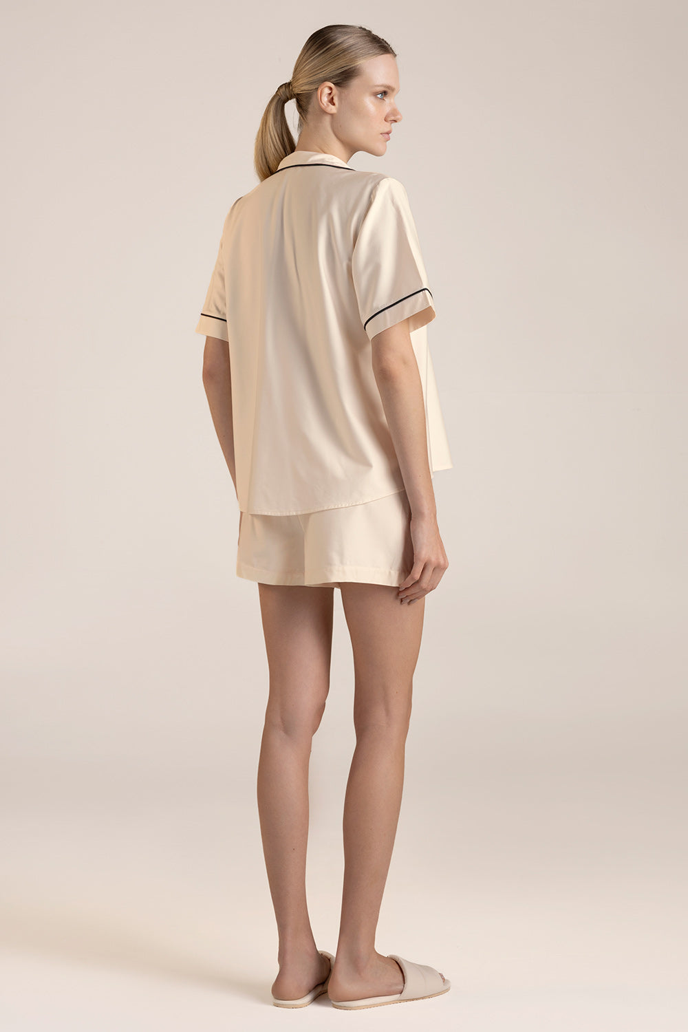 Pijama short elaborada en viscosa elástica. camisa manga corta, cuello resort con perilla de botones, bolsillo de parche delantero y vivos en contraste. short clásico bota recta. Color Marfil, Ref. 0528M62