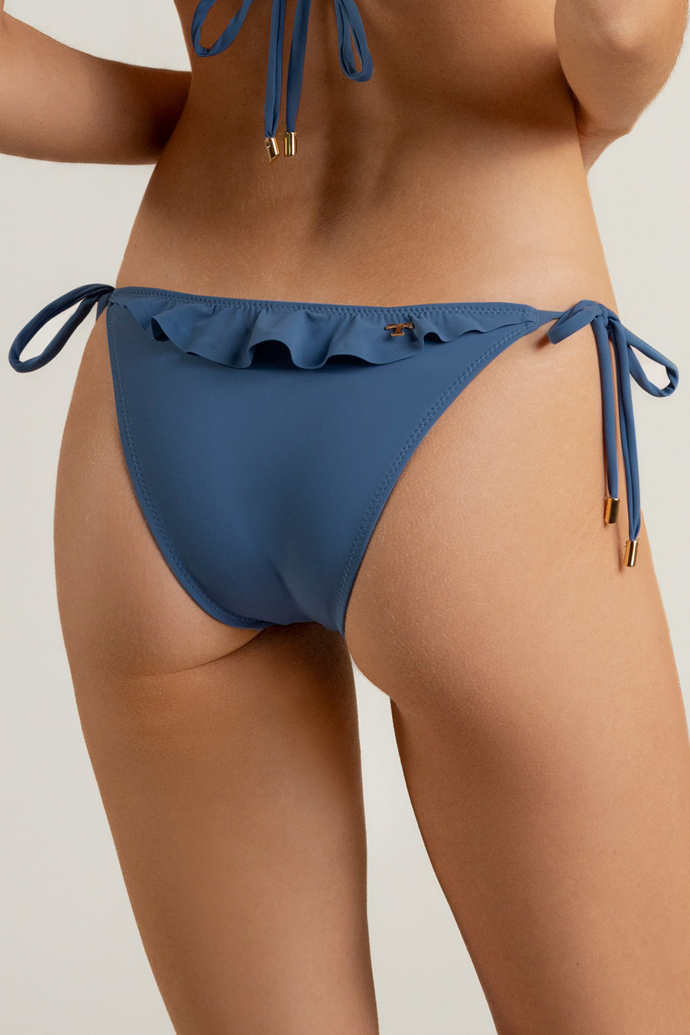 Bikini bottom clásico con amarres laterales para un mejor ajuste y un fit personalizado en color azul con boleros, detalle "t" en baño de oro para evitar oxidación característico de nuestra marca y tela con protección uv. Color azul, Ref. 0P16A53
