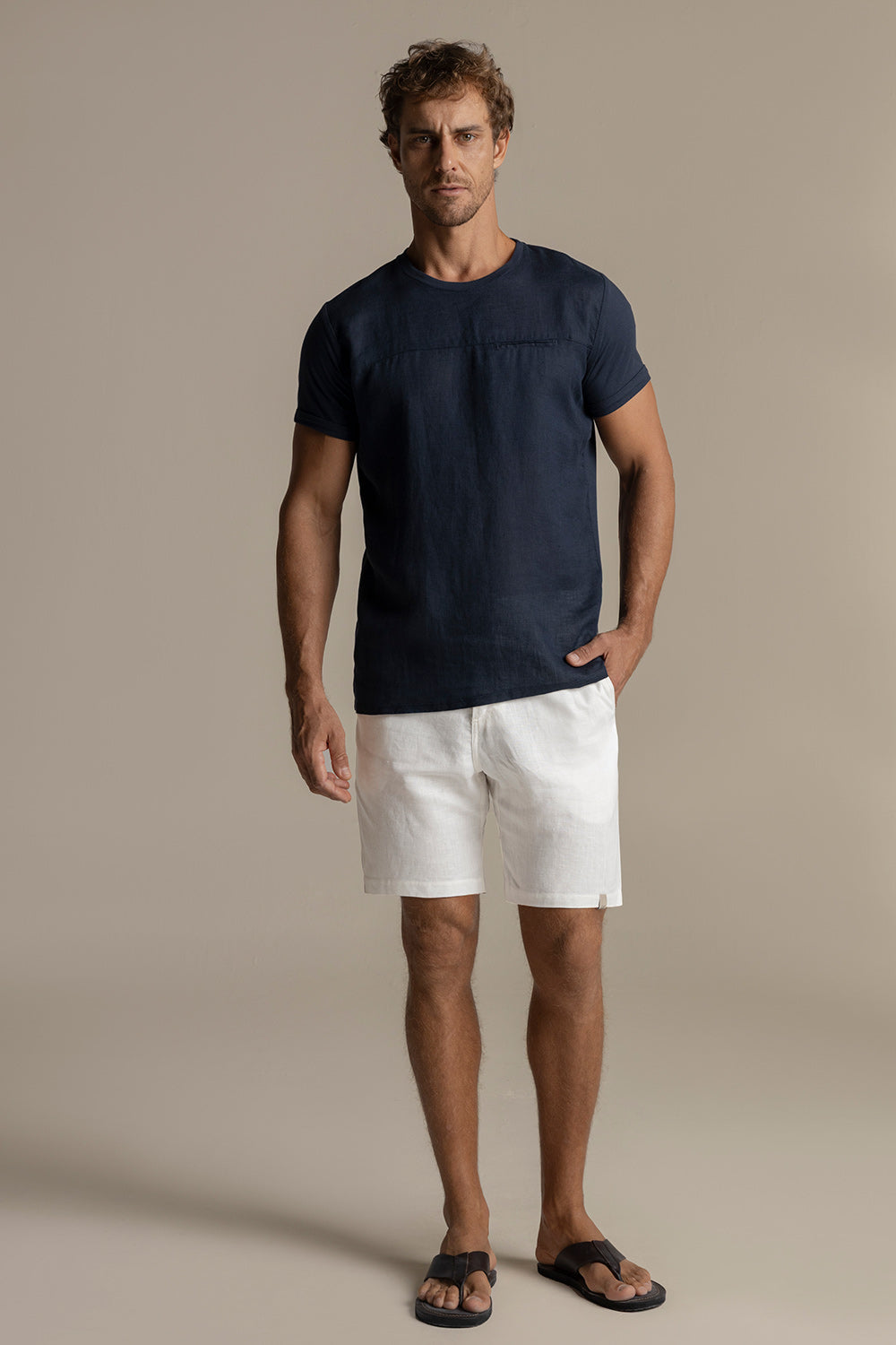 Camiseta jamaica con frente en lino, espalda y mangas en algodón, manga corta y bolsillo de ribete en frente. Color azul navy, Ref. SH06D21