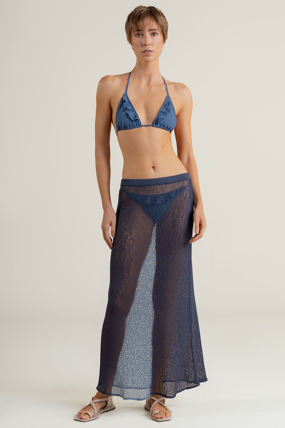 Falda en malla con mezcla de algodón reciclado en color azul, con pretina en rib, y detalle moneda con la "t" grabada en baño de oro, característica de nuestra marca para evitar oxidación. Color azul, Ref. 0F05A53