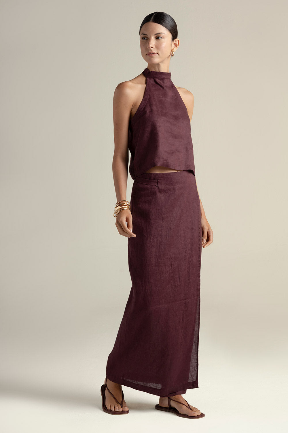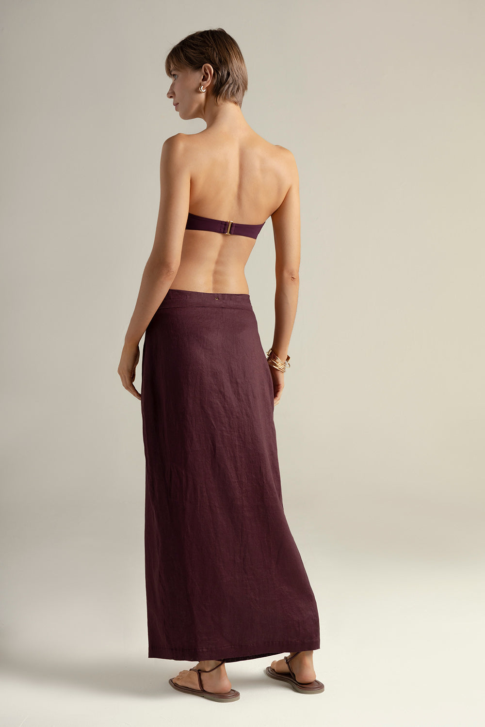 Falda pareo larga en lino 100%, color vino; cruzada al frente con botones internos y tiras laterales para un mejor ajuste y fit personalizado; largo midi; y detalle moneda con la “T” grabada en baño de oro, característico de nuestra marca. Color vino, Ref. 0F25V61