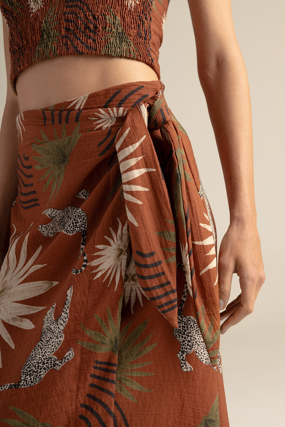 Falda pareo en tela estampada, color terracota; cruzado en el frente con botones internos y tiras laterales para un mejor ajuste y fit personalizado; largo midi; y detalle moneda con la “T” grabada en baño de oro, característico de nuestra marca. Color estampado terracota, Ref. 0F45061