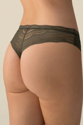 Panty semibrasilero de tiro medio elaborado en microfibra con brillo y encaje, posterior con efecto invisible, refuerzo en algodón. Color verde oscuro, Ref. 0222052