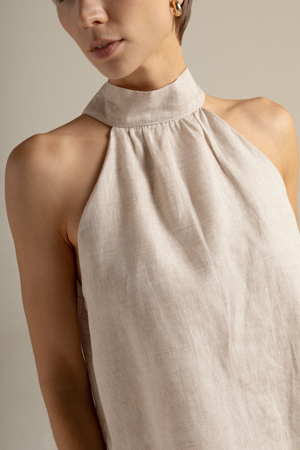 Top halter en lino 100%, color caqui; sin mangas; cierre en la parte posterior con botones; y detalle moneda con la “T” grabada en baño de oro, característico de nuestra marca. Color caqui, Ref. 0A71C61